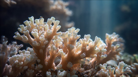 AI Generated. A tight shot of a coral with water bubbles at its base and a softly blurred background
