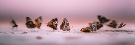 Colorful butterflies move around, filling the foreground with activity as a soft pastel background enhances the scene in a garden setting.