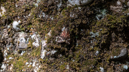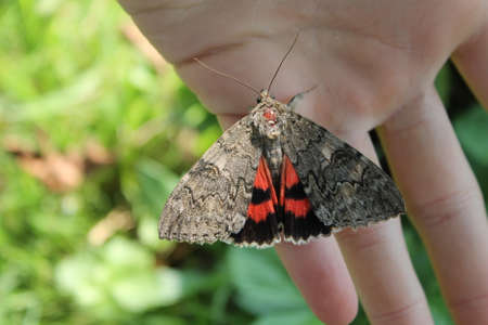 Red moth Catocala oberthuri feeds on tree sap close-up in nature, noctuidae, lepidoptera, butterfly