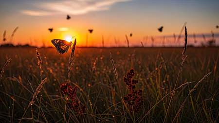 Butterfly in the meadow at sunset. Beautiful natural background.