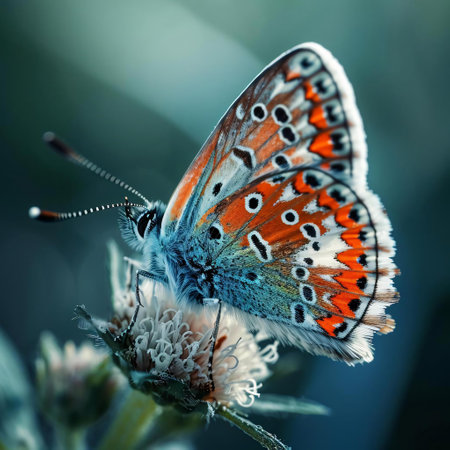 Detailed close-up of a butterfly resting on a flower, showcasing intricate wing patterns and vibrant colors.