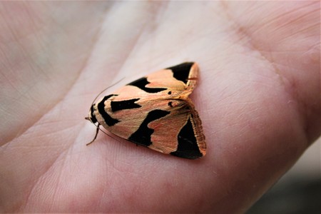 Cinnabar moth, Tyria jacobaeae, on a white background. Brightly coloured red and black insect. Copy space.