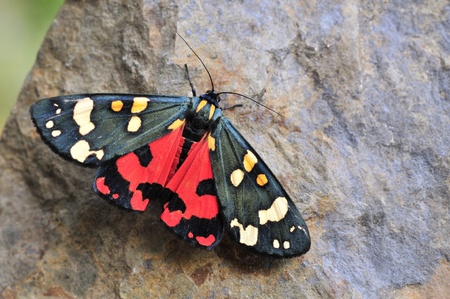 A beautiful red and black Greek butterfly from the butterfly dalina sits on a rock with moss.