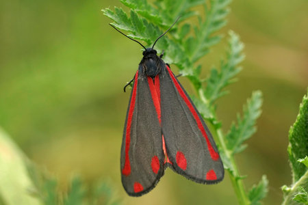 Colorful closeup on a red , metallic blue cinnabar moth, Tyria jacobaeae sitting on a green Tansy leaf