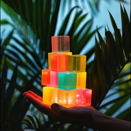 Colorful resin cubes sparkling on a table in sunlight, innovative production