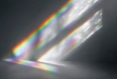 Abstract light refractions create a spectrum of rainbow colors on a clean white surface and wall, with soft light and shadow play.