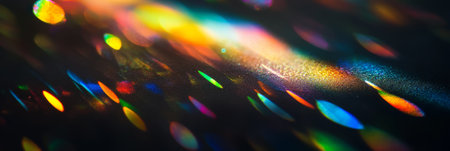 Vibrant light refractions creating a rainbow effect on a glossy surface with a bokeh background.