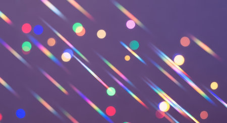 A vibrant abstract background featuring colorful, out-of-focus bokeh lights and diagonal streaks of refracted rainbow light, creating a dynamic and festive atmosphere.