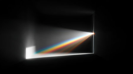 In a minimal dark room, white light hits a crystal prism. One path dims into void, while the other flares into a brilliant, expanding rainbow.