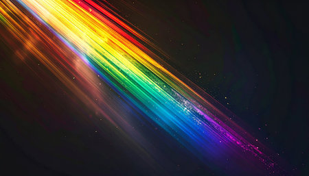 A vibrant light spectrum, featuring a range of rainbow colors, is captured against a dark backdrop. Diagonal lines and lens flares create a dynamic composition. The image's abstract nature and strong contrast suggest versatile applications in design, presentations, and creative projects.