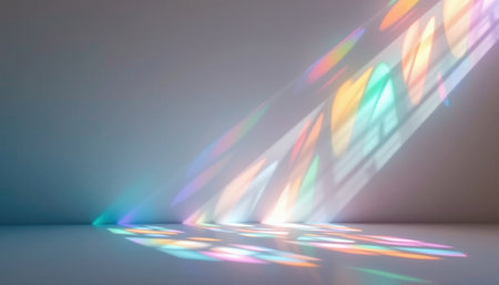 A beam of ethereal light refracts into a beautiful rainbow spectrum, casting vibrant, gentle colors across a clean, minimalist space. This tranquil scene evokes a sense of hope, innovation, and serene discovery, perfect for concepts of a bright future or creative inspiration.