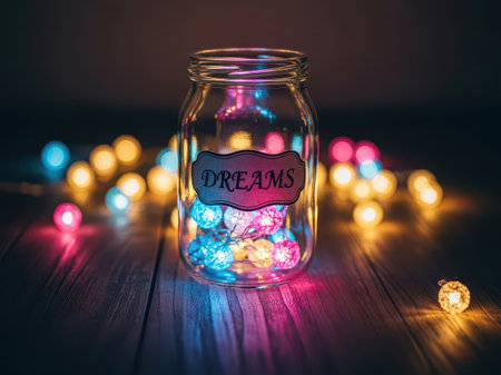 One open glass jar with colored lights on a wooden background with the inscription