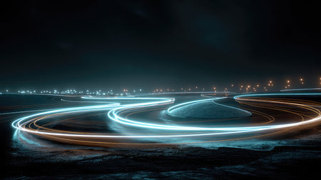 Dynamic light trails with blurred motion create a mesmerizing effect on a dark backdrop