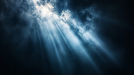 Experience a breathtaking scene where light rays pierce through dark clouds, creating a captivating and serene atmosphere that evokes a sense of wonder.