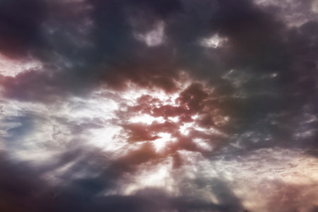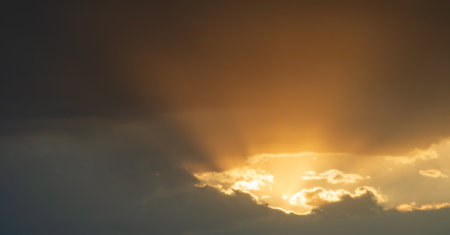 Majestic clouds illuminated by sunlight create dramatic sky scene, showcasing rays of light piercing through dark storm clouds. interplay of light and shadow evokes sense of awe and tranquility