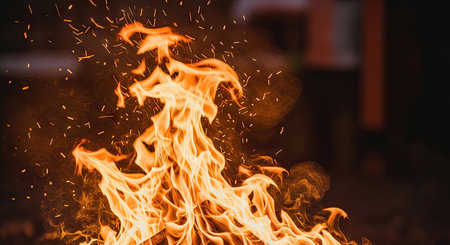 fire flames with sparks on a black background, closeup of photo