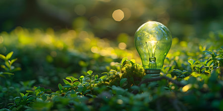 A captivating light bulb cradled by lush green moss, set in a tranquil forest environment, symbolizes sustainability and the beauty of nature.