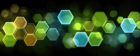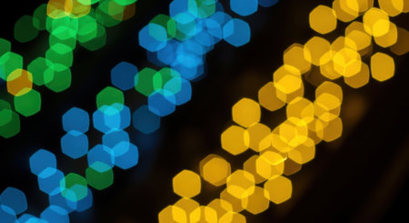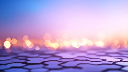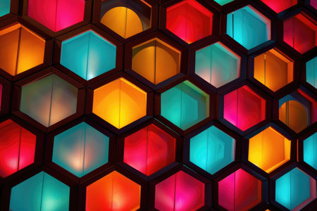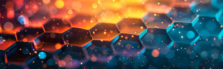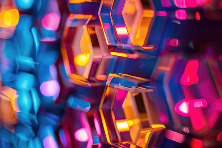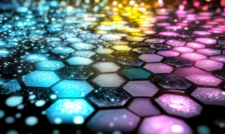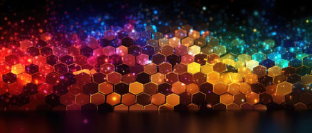 Abstract multicolored hexagon surface with bokeh lights, ideal for background
