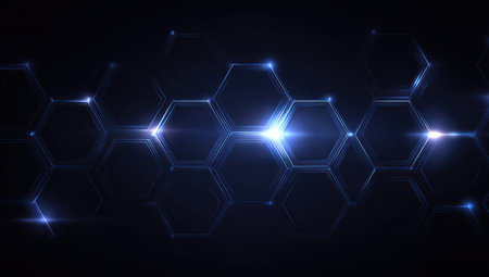 Dark digital background with glowing, interconnected hexagonal shapes
