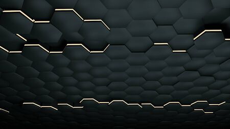 Abstract black hexagon background with metal texture and yellow lightning. Polygonal dark surface. Futuristic technology concept. Hex geometry pattern. 3D Rendering.