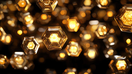 This captivating image features glowing honeycomb shapes illuminated in warm golden light, creating an enchanting atmosphere ideal for artistic projects or modern design elements.