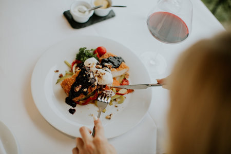 A person enjoys a beautifully plated seafood dish topped with sauce and nuts while sipping red wine at a bright restaurant. Fresh ingredients and vibrant colors attract attention.