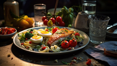 A plate of a meal with vegetables and meat on it, AI