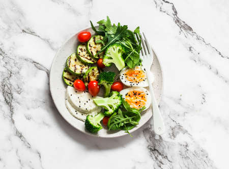 Vegetarian breakfast bowl - salad mixed vegetables, boiled egg, grilled zucchini, cheese on a light background, view over