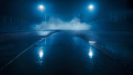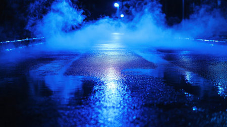 A captivating misty night scene featuring a lonely road illuminated by blue light, showcasing reflections on the wet surface, exuding a tranquil atmosphere.