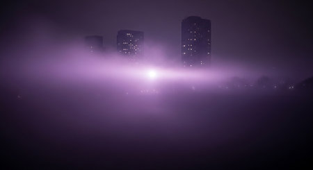 Vibrant blue purple and green light illuminates hazy fog or smoke with faint building silhouettes in the distance.