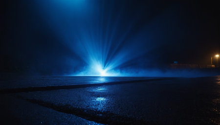 A tranquil road shrouded in thick fog is illuminated by a striking blue light beam, creating an atmospheric and mysterious setting ideal for dramatic visuals.