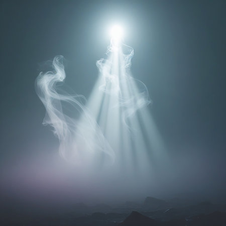 The image captures a mystical scene where a bright light pierces through dense fog, creating an ethereal atmosphere. The light beams down from above, illuminating the misty surroundings and casting an enchanting glow. The scene evokes a sense of mystery and tranquility, with the light's rays creating a dramatic contrast against the dark, foggy backdrop.
