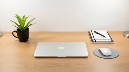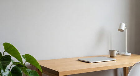 A minimalist desk with a laptop, mug, and plant against a plain wall, ideal for a clean workspace.