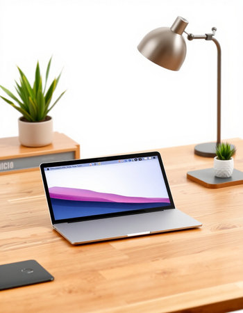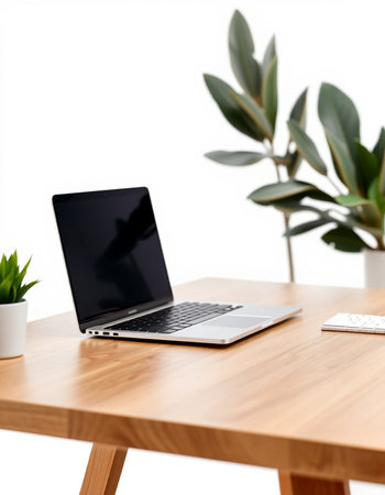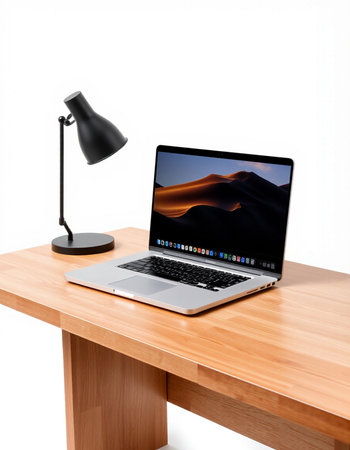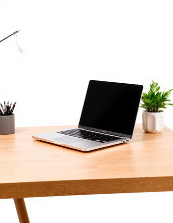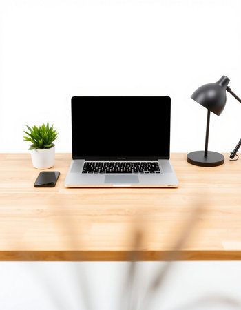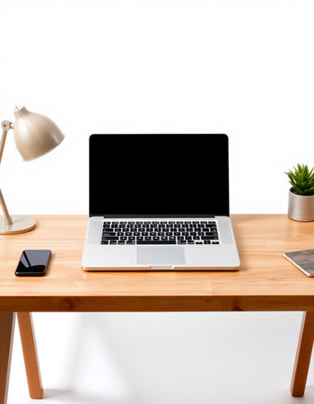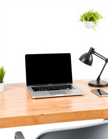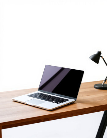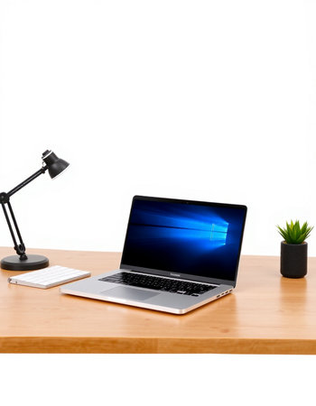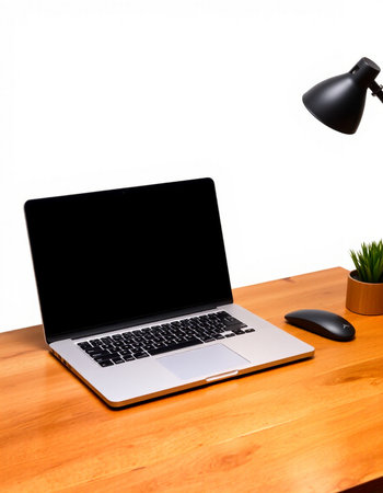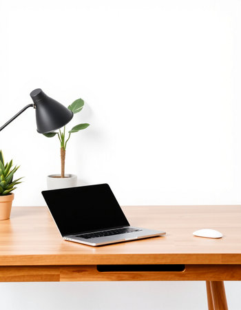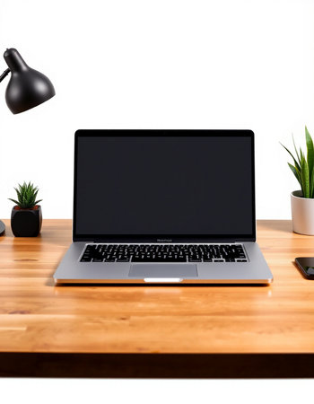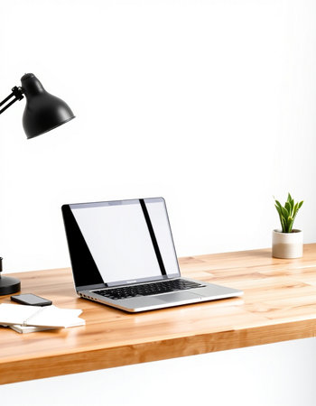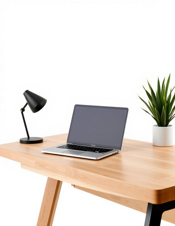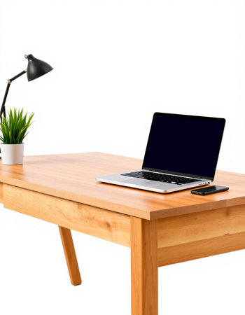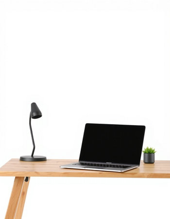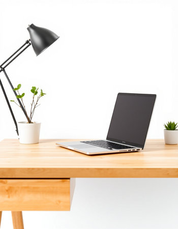Laptop on wooden desk with black lamp and plant isolated on white background