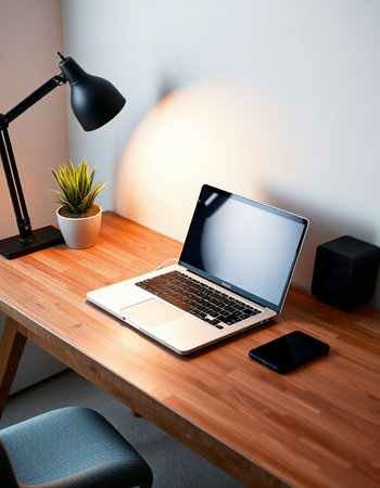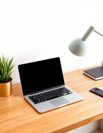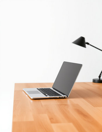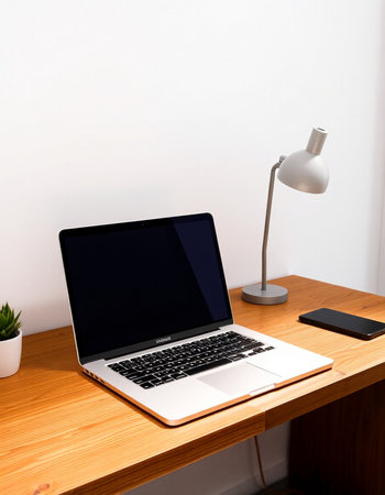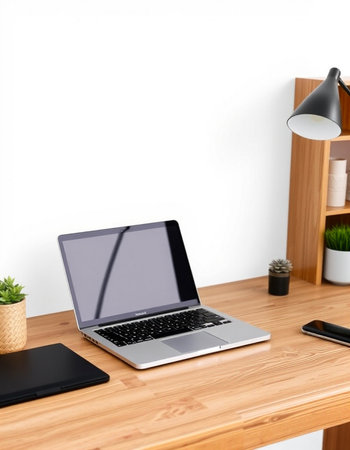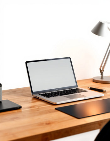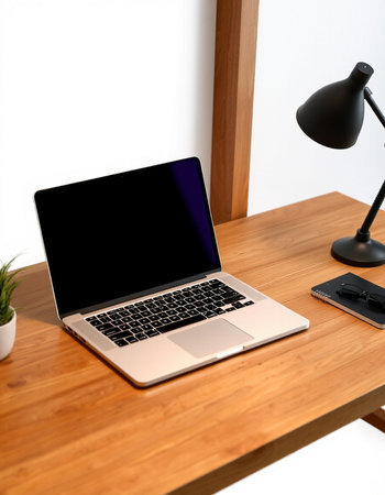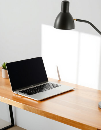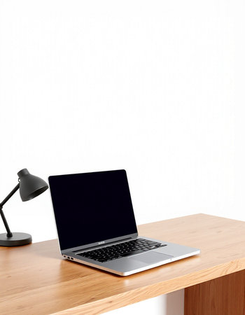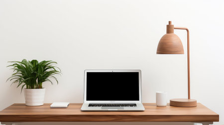 Laptop with blank screen on wooden desk and lamp on white wall background