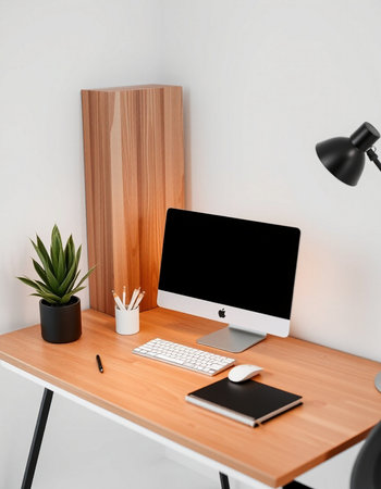Minimalistic workspace with computer, keyboard, mouse and other items