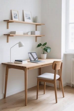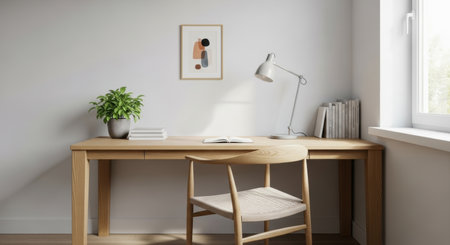 Minimalist home office with wooden desk, chair, and indoor plant by a sunny window.