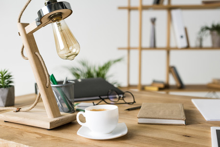 Laptop on wooden desk with coffee cup, lamp and picture on wall