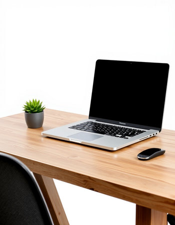 Modern workspace with laptop, smartphone and plant on wooden desk isolated on white background