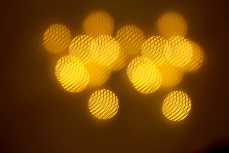 Yellow lens flare. Defocused circle lights. Night party gleam effect. Abstract black background.