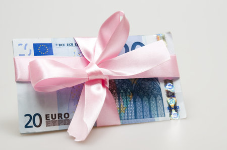 Hand holding showing euro money and giving or receiving money like tips, salary. 20 EURO banknotes EUR currency isolated. Concept of rich business people, saving or spending money.