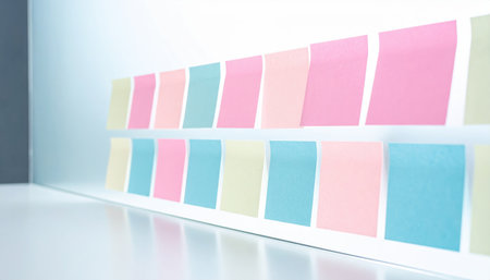 sticky notes in soft pastels arranged as gradient on glass side rim light wide negative field