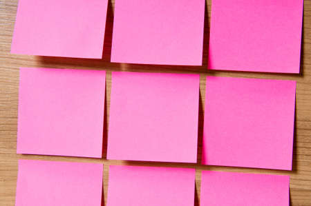 Stack of yellow and pink sticky notes on desk in front of window, workspace organization and planning concept