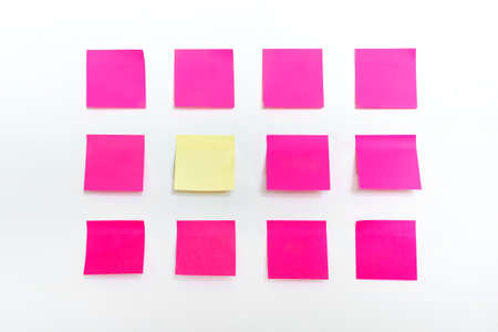 Rows of many colorful bright empty pink sticky paper notes and one stand of a kind stand yellow sticker isolated on white wall textured background. Attached blank memo mockup to do notepad