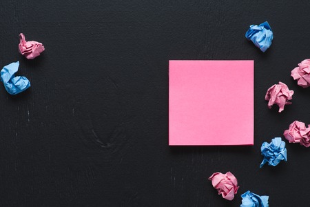 top view of scattered pink and blue crumpled paper balls with sticky note on black background, think different concept