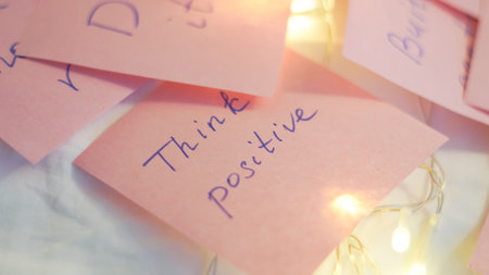 Pink cards with handwritten positive affirmations and fairy lights in soft focus background