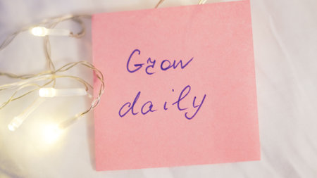 Pink sticky note displaying the words Grow daily on a white background with fairy lights