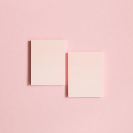 Two hot pink square paper notes on a white background. Brainstorming template with copy space