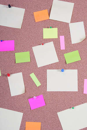 Many colorful sticky note, post note or post-it on white wooden vintage background. space for your text