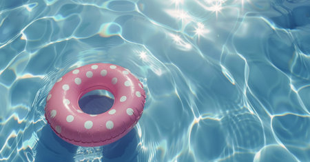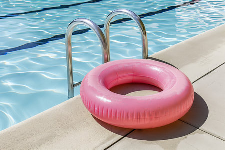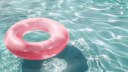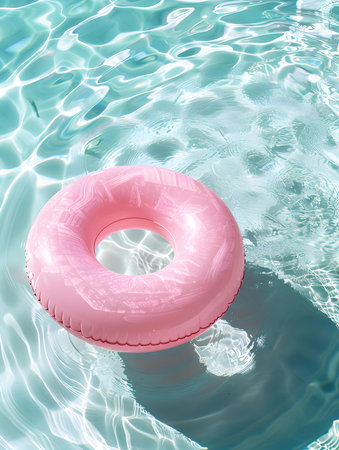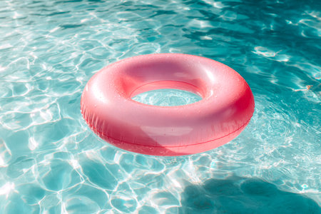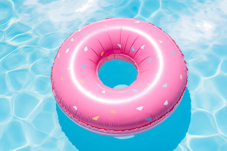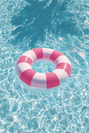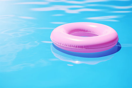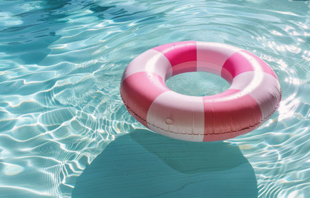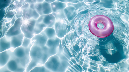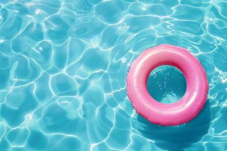 Tranquil Oasis: A Vibrant Blue Pool Surface Reflects the Presence of a pink Life-Saving Inflatable Ring. Vacation and holiday concept